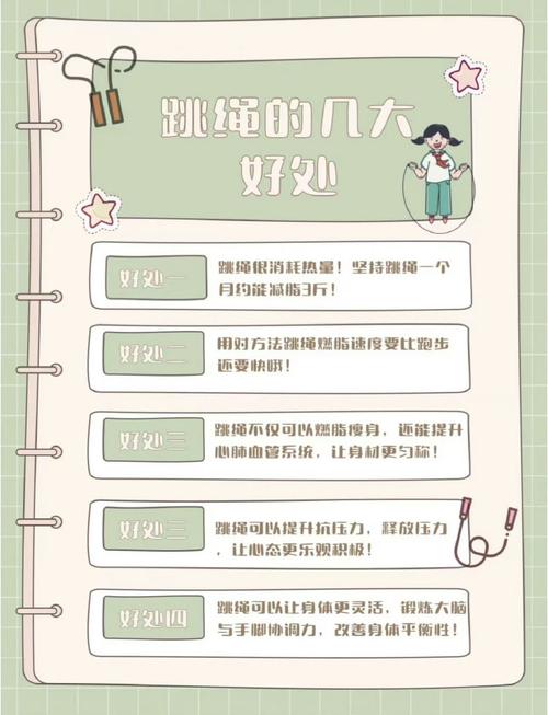 除了基本的跳绳技巧外,还有一些高级技巧,如“快速旋转”、“跳跃换位”等,这些技巧要求运动员具备较高的身体控制能力和反应速度,跳绳还可以结合其他运动元素,如舞蹈、武术等,创造出更加多样化的运动形式。